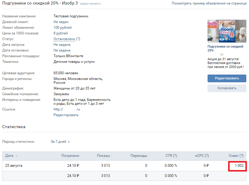 - Если кампания была запущена менее часа назад, попробуйте подождать — ВК может зайти с задержкой.