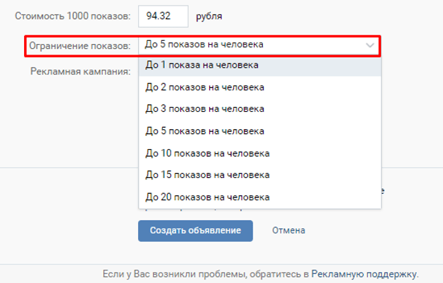 Это позволяет охватить большее количество пользователей: каждый человек из выбранной аудитории сможет увидеть объявление не более 100 раз. Далее, объявление будет показано другим пользователям. На данный охват также влияет уровень конкуренции. В любом случае стоит выбирать данный пункт, чтобы объявление не показывалось постоянно одним и тем же пользователям.